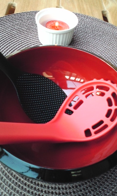 セールでしたので、つい…。ブラックカラーの小ぶりなおしゃもじと穴あき型お玉。そしてあま~いストロベリーの香りのアロマオイルとブラウンカラーのポリプロピレン製のランチョンマッツト。