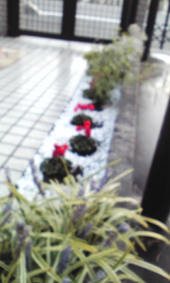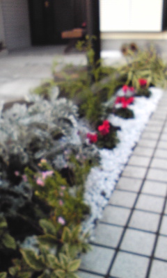 この夏の猛暑で、玄関アプローチの植栽が弱ってしまいましたので、土壌改良を少しして、傷んだ苗と入れ替えに、ガーデンシクラメンを植えて、真ん中に一年中グリーンが美しいシマネトリネコという苗木を植えて、周りには雪をイメージして真っ白な小石を敷き詰め、アレンジメントフラワー風にガーデ二ングしてみましたよ♪。