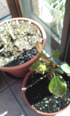 こちらは、寒さに負けてしまい、葉を落とし元気を失くしたハイビスカスの鉢植えと、庭のアジサイの苗。
