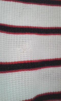 さすがにラガーマン仕様のブランド。長年使用しても仕立てが良く型崩れもなく色あせもありません。が、どこで引っ掛けたのか、いつのまにか穴が二箇所。
